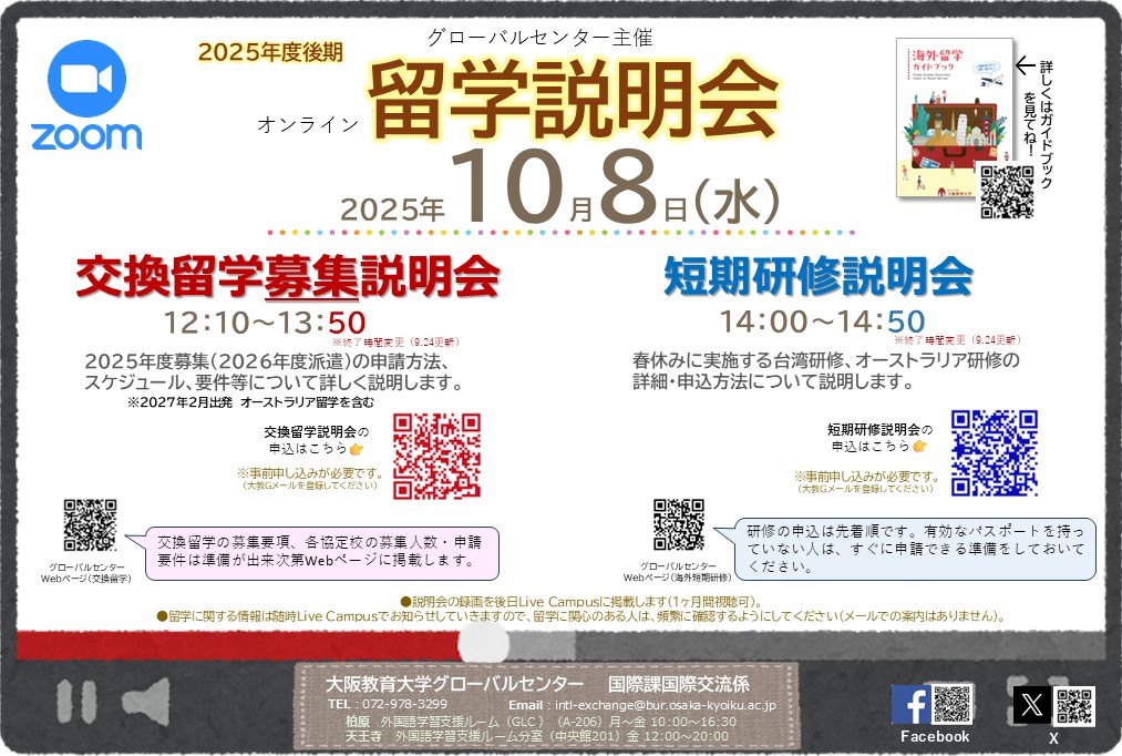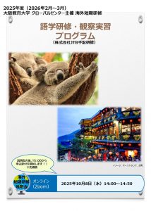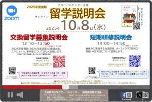 【日時】2025年10月8日(水)14:00~14:45 50 海外短期研修説明会 ※終了時間を変更(2025.9.24更新)